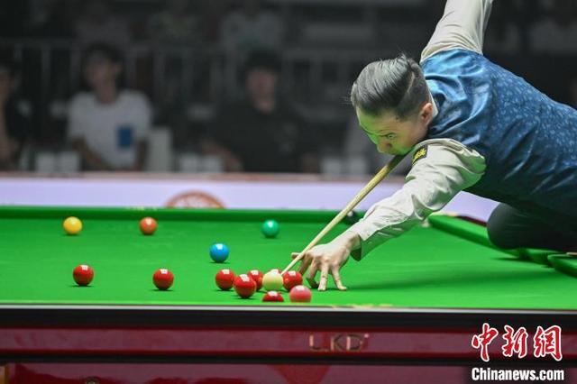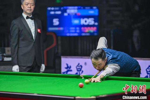 7月6日,中国·峨眉山CBSA斯诺克巨星邀请赛上,中国斯诺克选手肖国栋与老将约翰·希金斯展开巅峰对决,经过激烈角逐,肖国栋以5比2胜约翰·希金斯,精彩的球技为球迷们带来了一场高水平的斯诺克盛宴。图为比赛中老将约翰·希金斯使用架杆击球。中新社记者 刘忠俊 摄