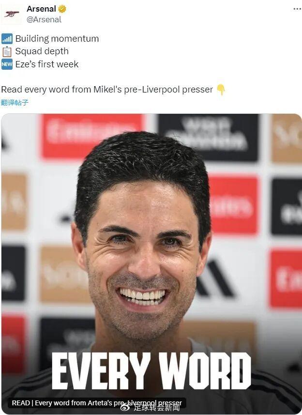 阿尔特塔出席了赛前新闻发布会,我们来看伤病等关键信息。