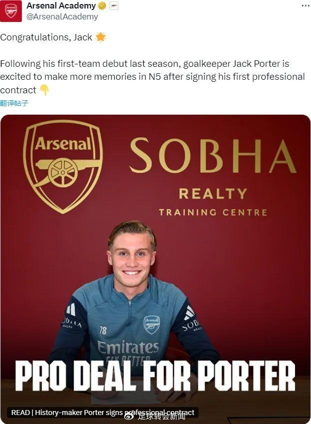 官方:阿森纳宣布和杰克-波特签下了他的第一份职业合同。